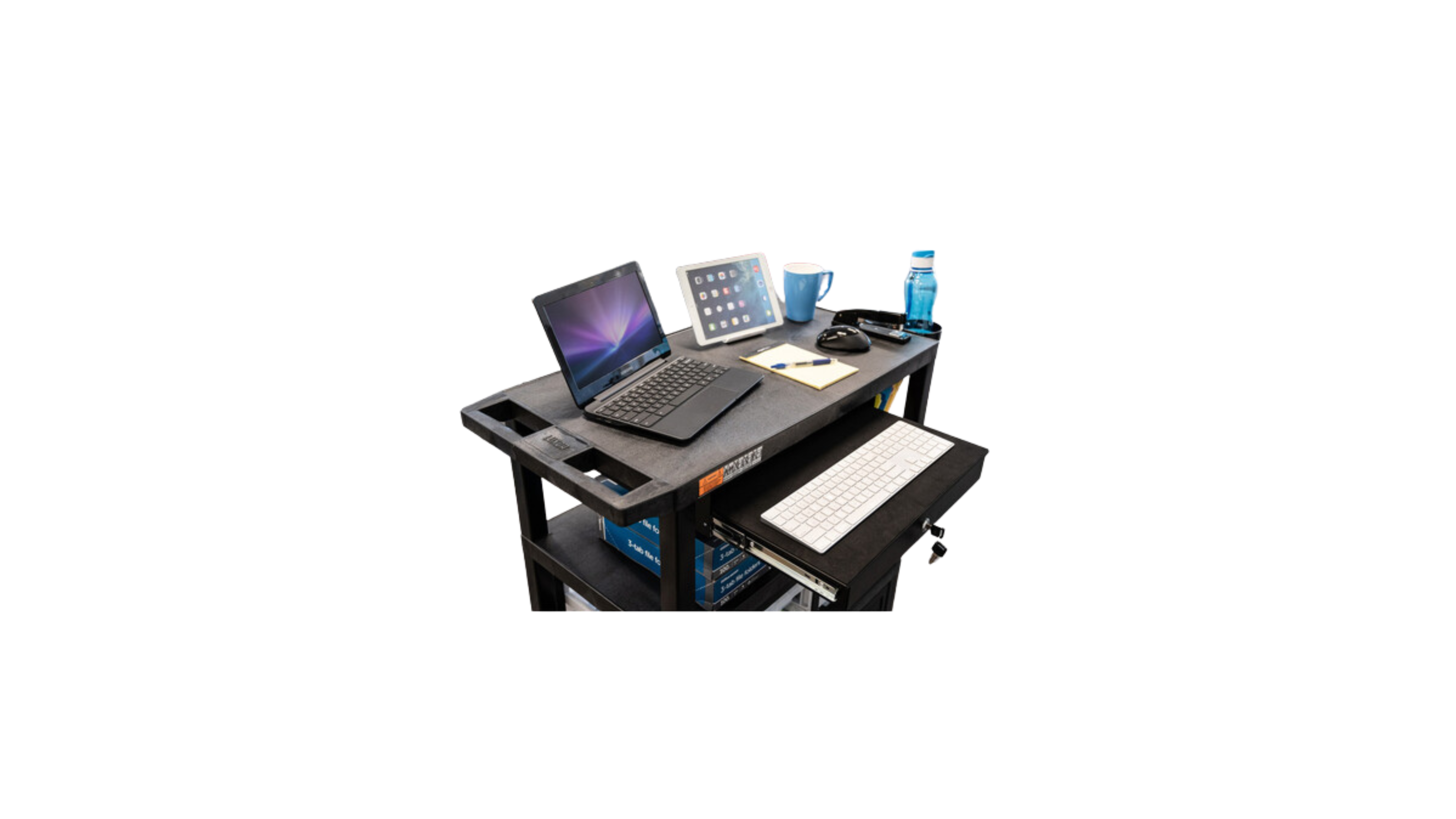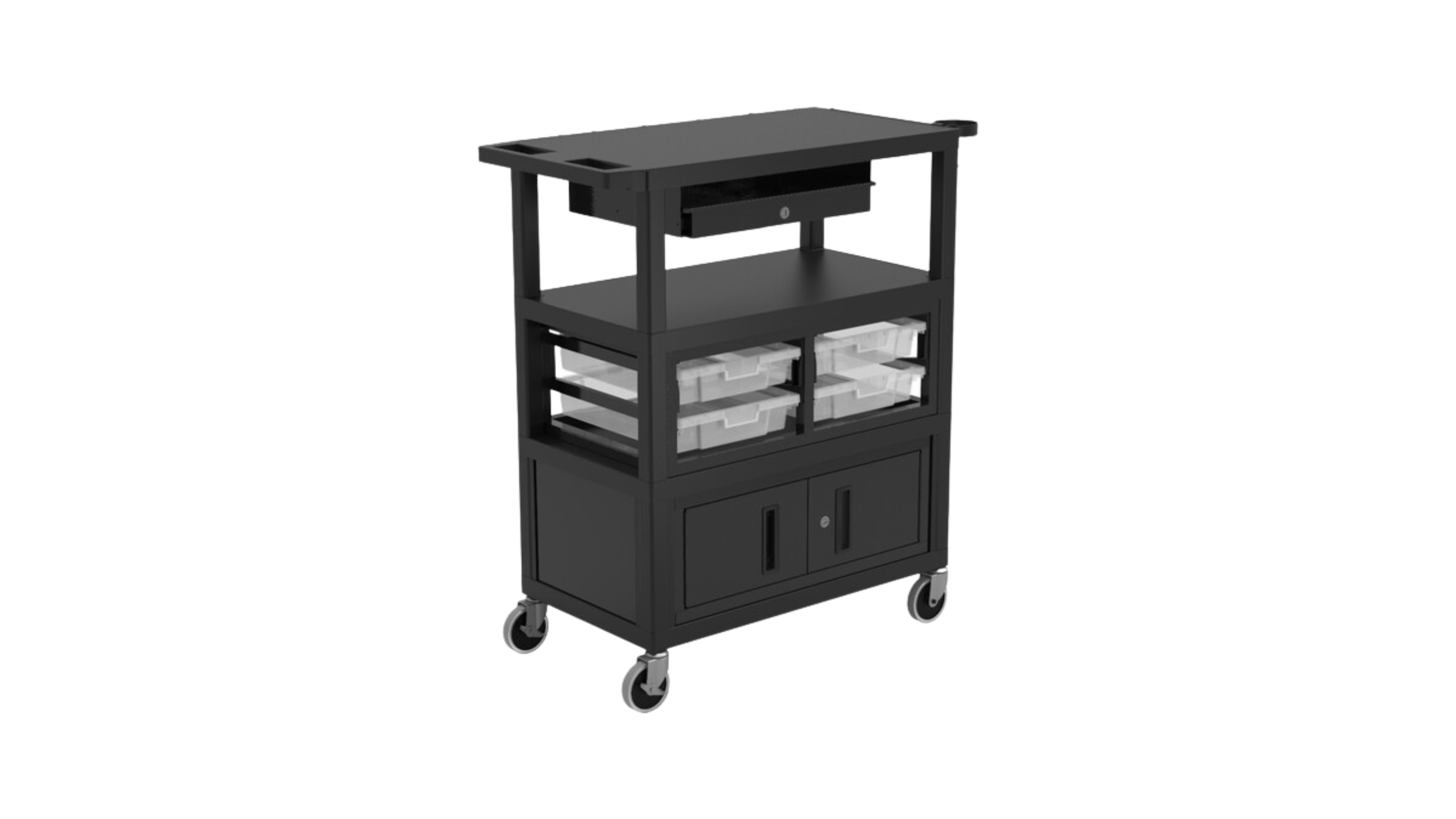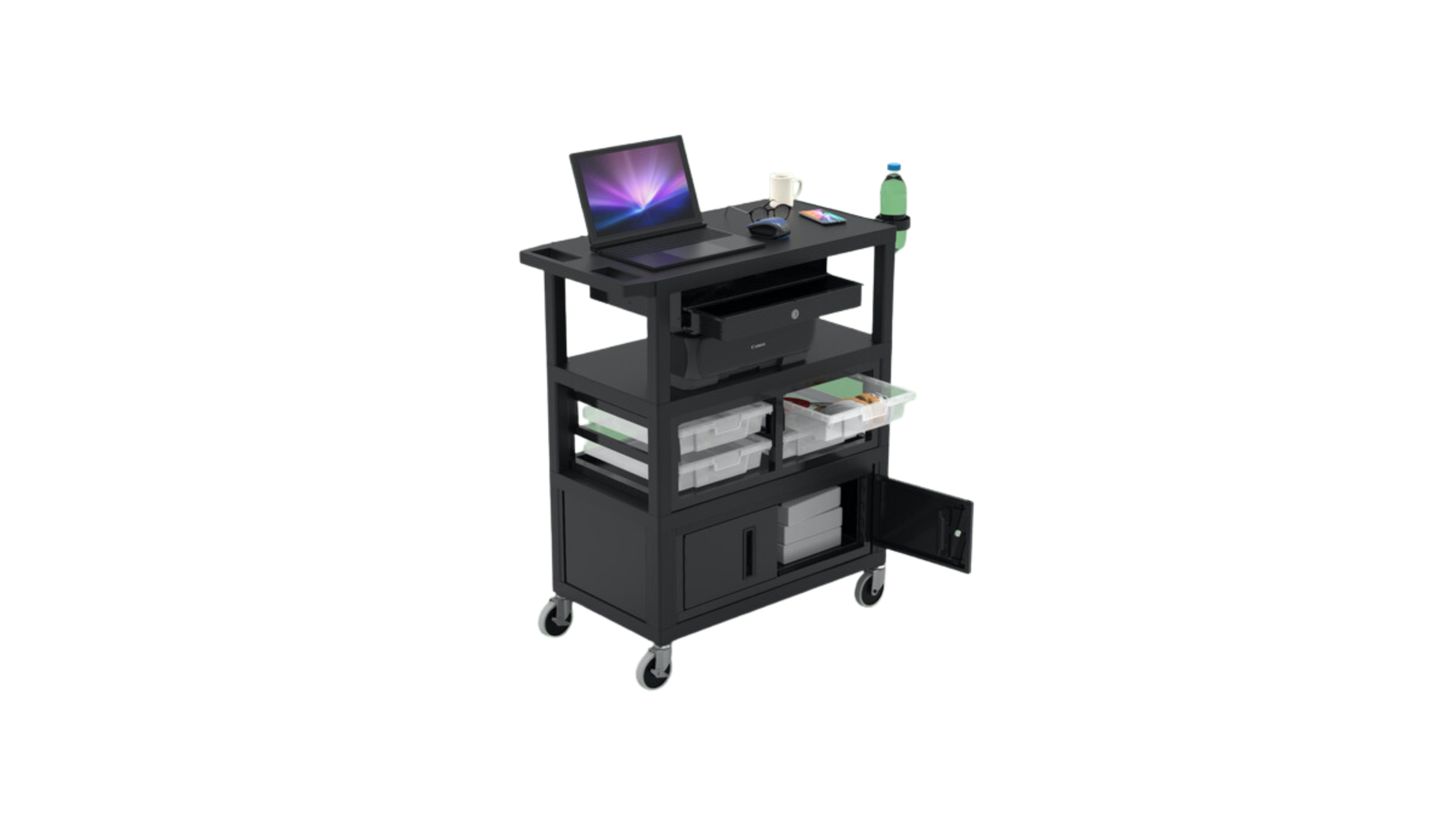 Whether a room needs to accommodate multiple teachers or a teacher needs to remain mobile 32 x 18" Deluxe Teacher Cart with Locking Cabinet & Storage Bins from Luxor solves the problem. The cart has nearly anything a modern teacher could want. A lockable cabinet and drawer help to keep teacher's belongings safe and secure, while four plastic pull-out trays are freely available for essential books and supplies. Above the drawers are two shelves that can accommodate multiple devices, considering the cart offers a 3-outlet 15' electrical assembly. Teachers can power a laptop, printer, and more. Moving in within a room or from class to class is made easy, thanks to dual push handles molded into the top shelf and 4" full-swivel TPR caster wheels.